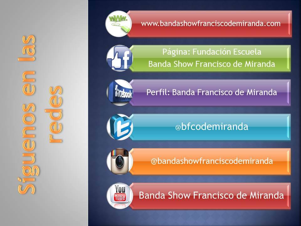 En el estado Miranda no existía una banda show con calidad, presencia y estilo que representara a la entidad en los actos protocolares donde asistía el gobernador o sus directivos. El 18 de octubre de 2003 en un acto público realizado en la concha acústica del Parque del Este de Caracas recibimos el nombramiento como Banda Show Francisco de Miranda convirtiéndonos así en la banda oficial del Estado Miranda. Con el nombramiento de Banda Show Francisco de Miranda se adopta un uniforme con los colores del pabellón estatal: amarillo, verde y azul. Recientemente y debido al cambio en la bandera del Estado Miranda, la banda adquiere nuevos uniformes cónsonos con los colores del gobierno regional: rojo, amarillo y negro. En enero de 2004, la Fundación Escuela Banda Show Francisco de Miranda asiste a su primera competencia como banda oficial mirandina, realizada en el Estado Bolívar al sur de Venezuela. Allí estuvieron presentes las mejores bandas show del país con el ánimo de medir sus habilidades y ganar la justa. ¿Los resultados? La Banda Show Francisco de Miranda obtiene el tercer lugar de la competencia en lo que sería el primer peldaño de una escalera de éxitos que vendrían a posteriori.u0026hellip;
